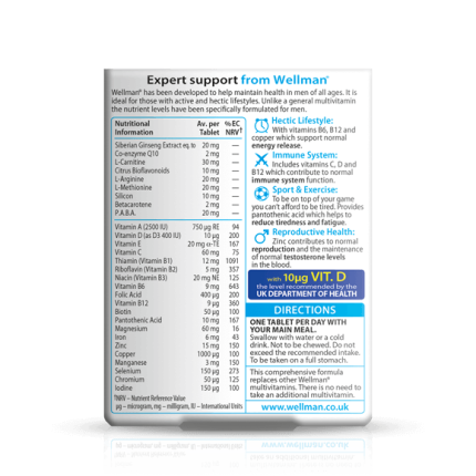 سیستم ایمنی سالم برای سلامت خوب بدن مهم است. قرص Wellman شامل ویتامین A، C، D، B6 و B12 به علاوه اسید فولیک و مس است که به عملکرد نرمال سیستم ایمنی کمک میکند. این مکمل 10 میکروگرم ویتامین D، سطح توصیه شده توسط وزارت بهداشت انگلستان را تامین میکند.